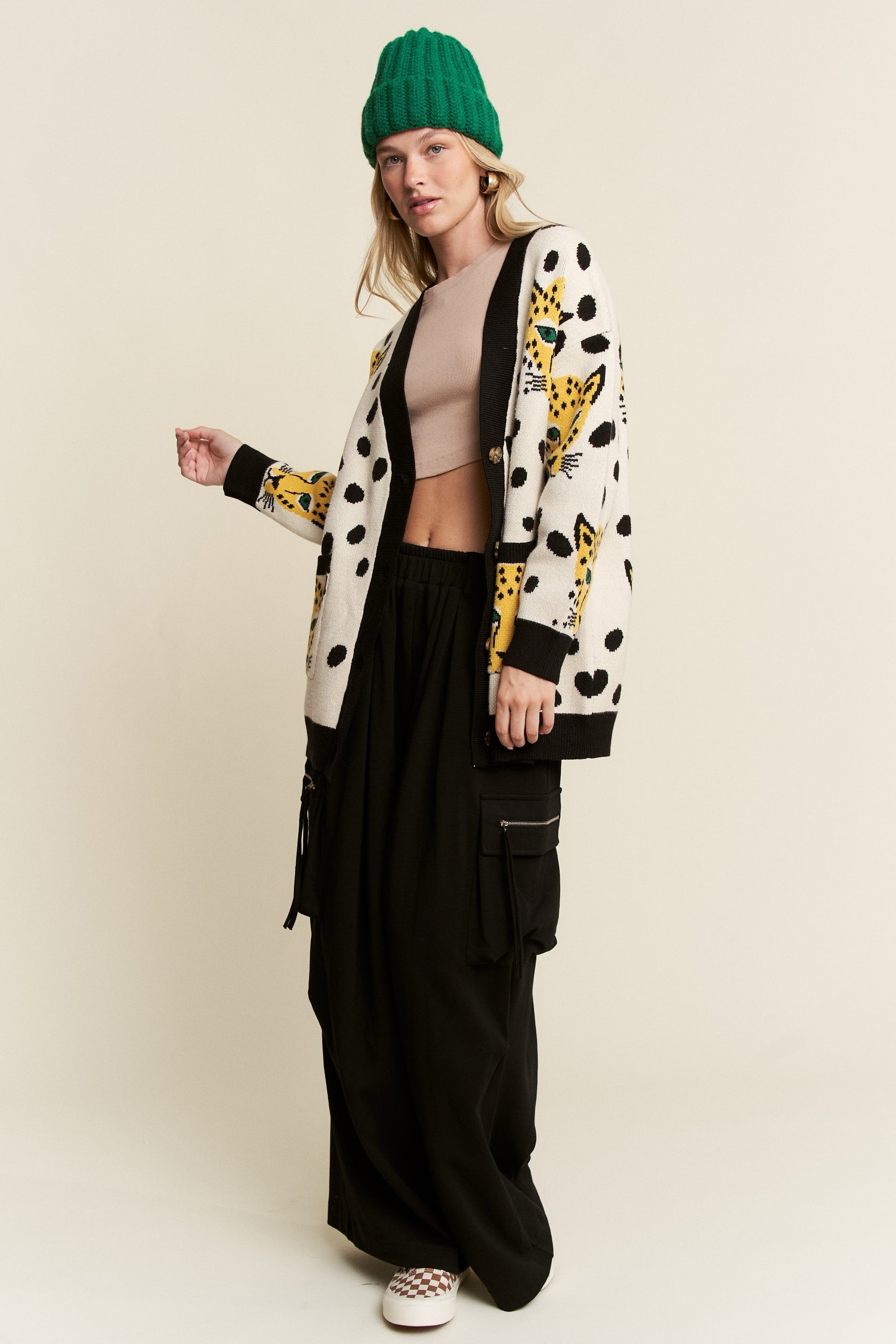 Introducing the Cheetahlicious Cardigan—a sophisticated take on playful style. This oversized button-down features a bold cheetah pattern elevated by refined colored cuffing and trim details. Crafted from an exceptionally soft, stretchy knit that moves with you, it offers both comfort and structure. Functional square front pockets add practicality to its statement-making design. Perfect for layering with intention and confidence.