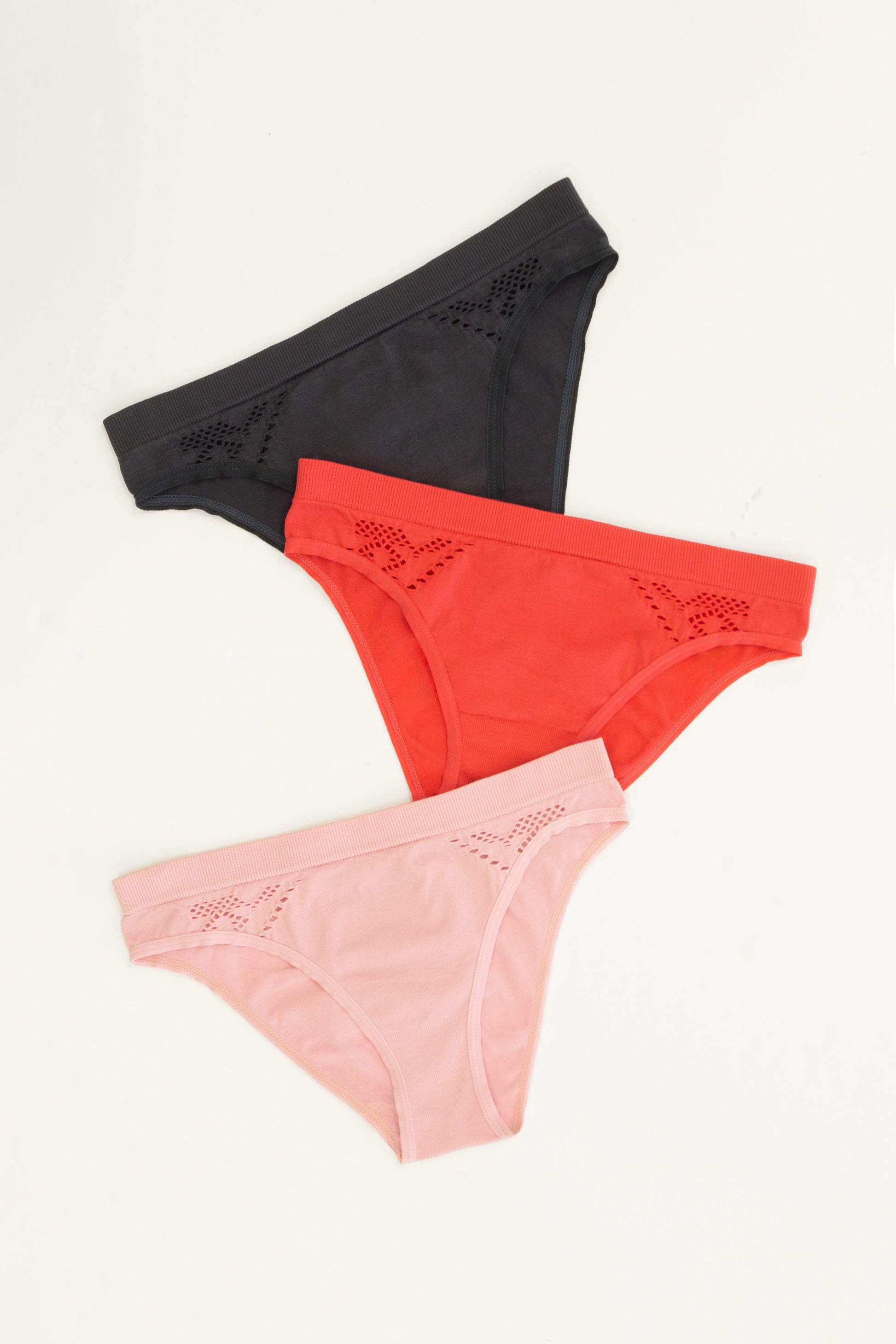 Stay comfy and cheeky in our lace cut out panty pack. Featuring soft fabric with lace cut out details and a ribbed band. 3 pack Colors: Pink, Red, and Charcoal Material: 90% Nylon 10% Elastane