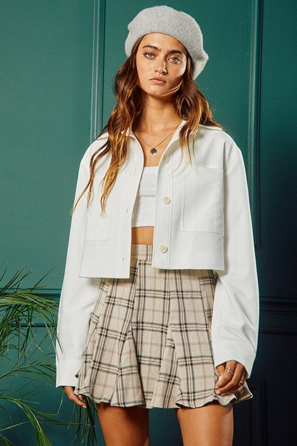 This Ivory Solid Chopped Jacket features a refined, structured weave that adds a polished touch to any outfit. Its cropped length enhances a modern silhouette, while the large front pockets combine practicality with elegant design. Perfect for elevating your wardrobe with understated sophistication.