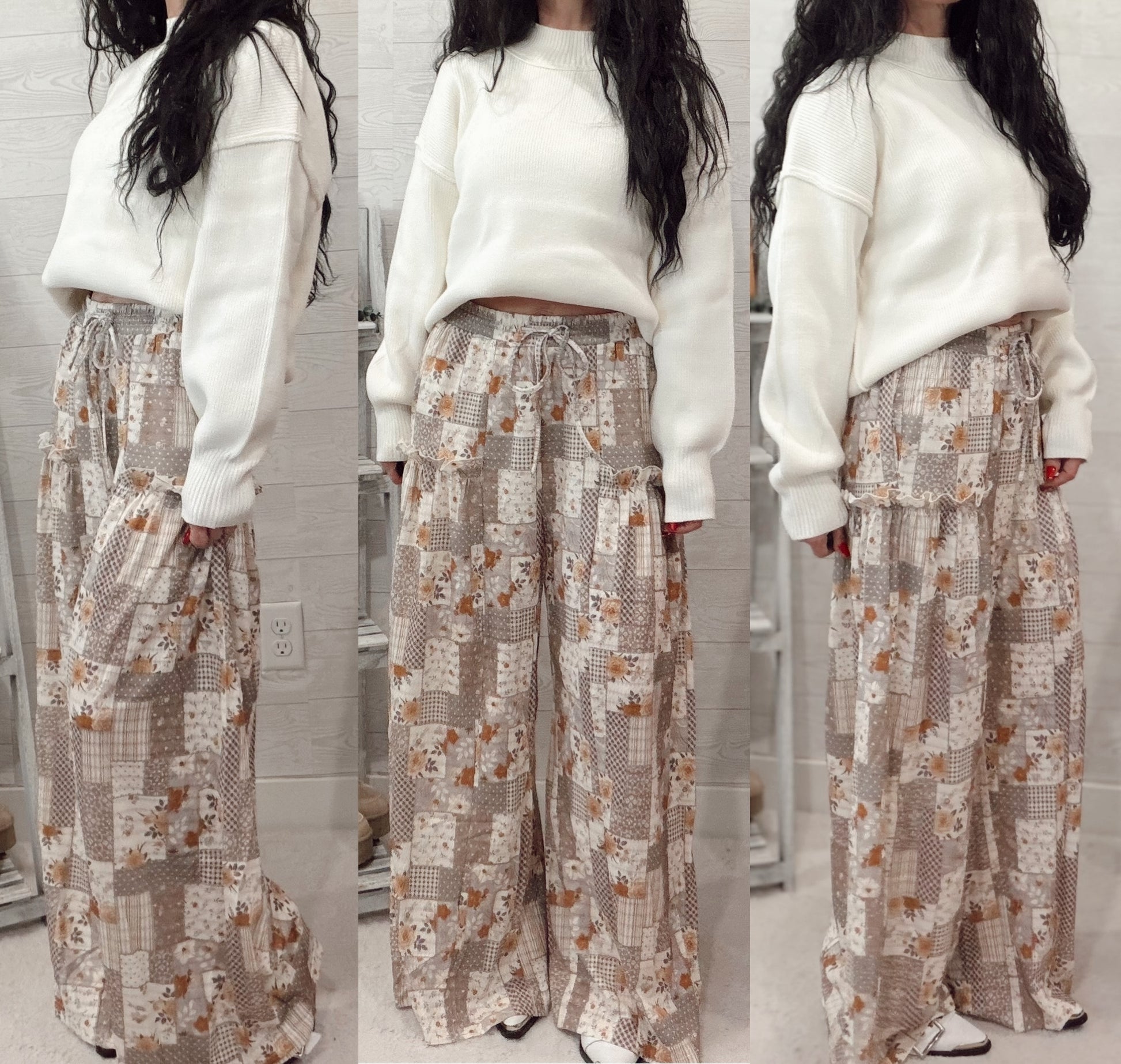 PATCHWORK PRINT TEXTURED KNIT WIDE LEG PANTS
