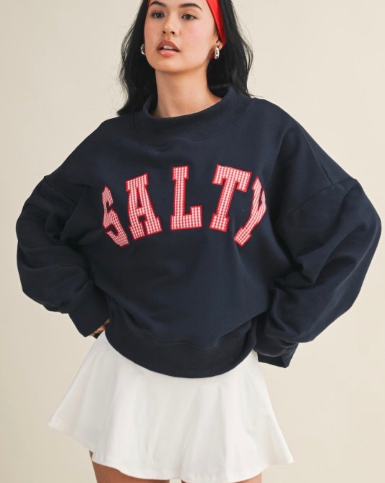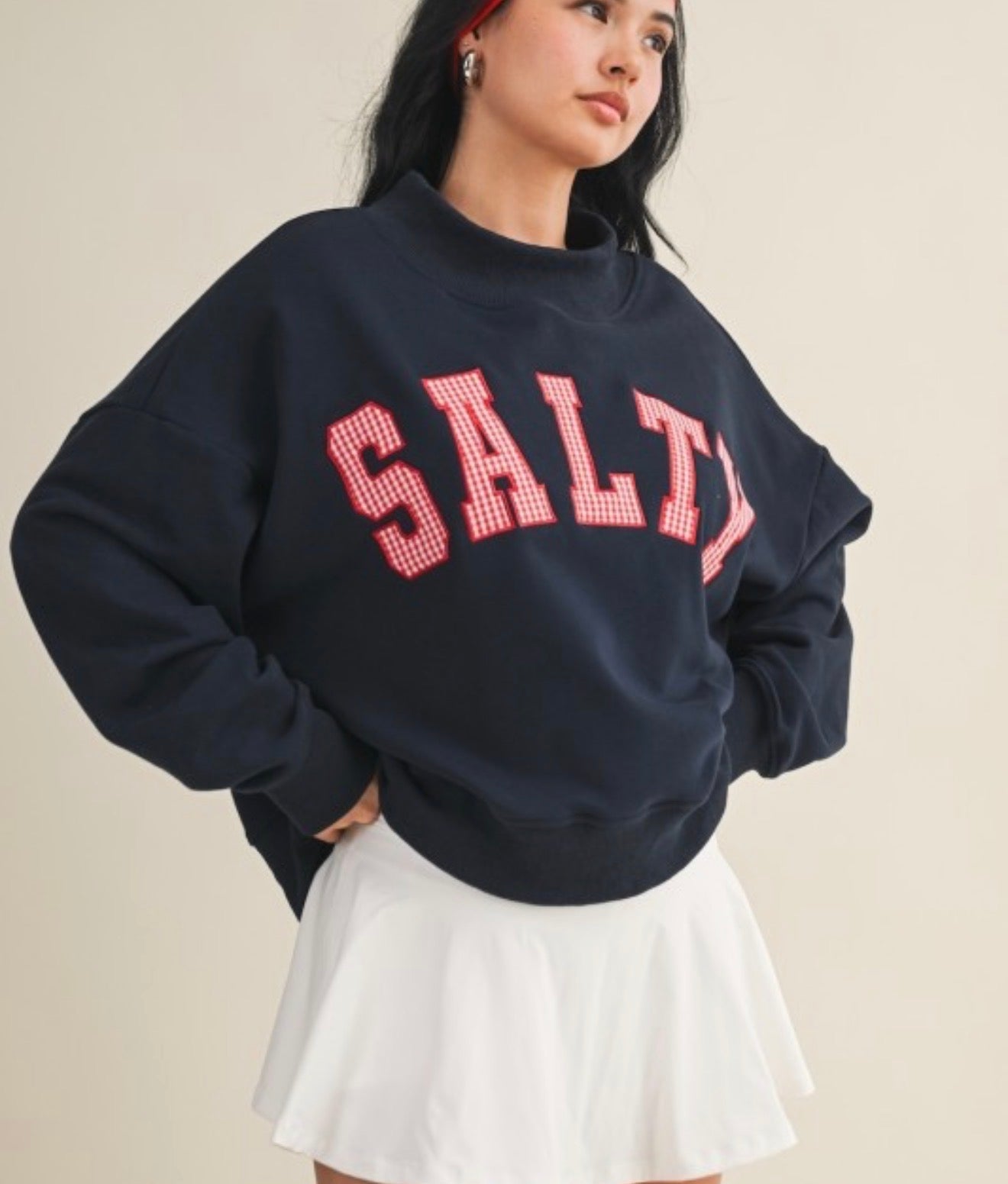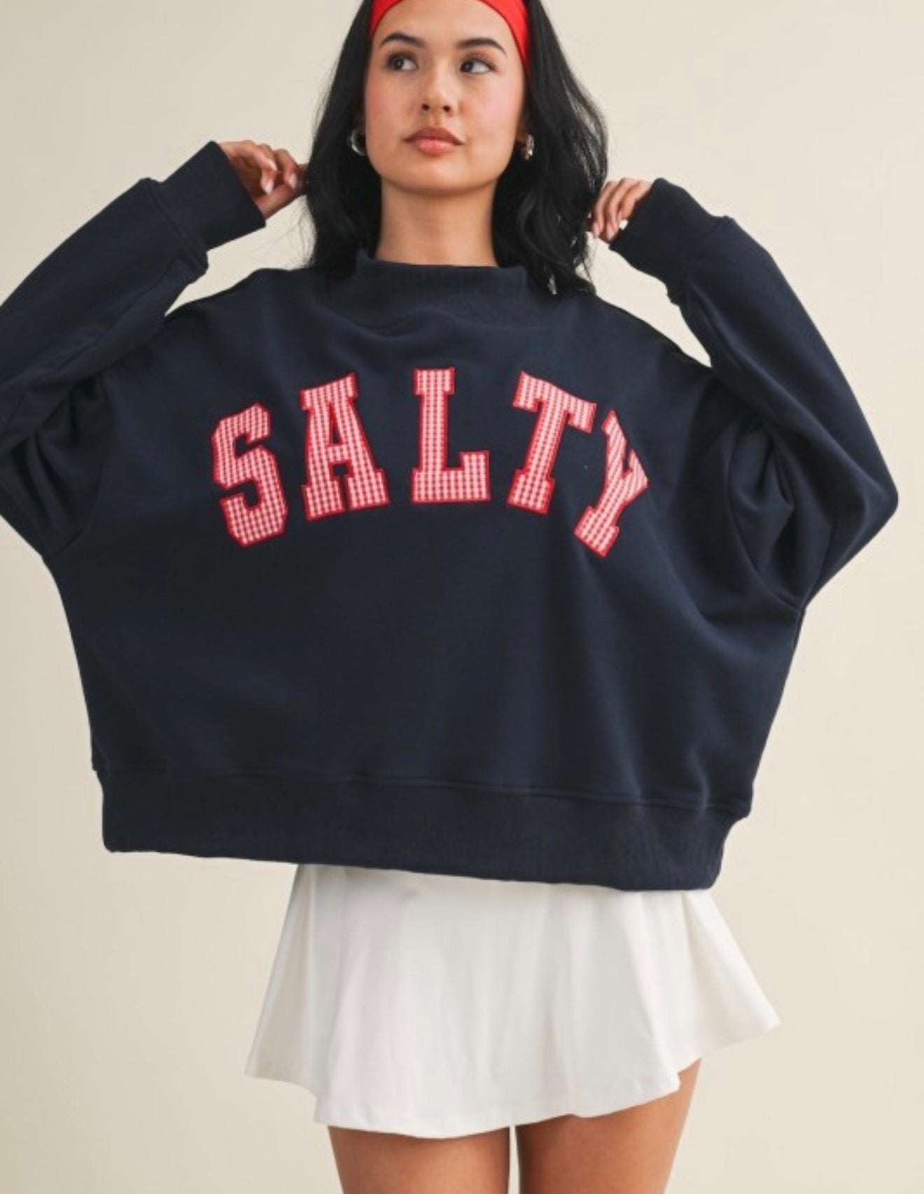 Embrace laid-back comfort in this oversized picnic plaid sweatshirt. Featuring a classic mock neck and soft, stretchy fabric, it's perfect for casual days when you want to feel cozy without sacrificing style. The navy base with plaid detailing adds a timeless touch that pairs effortlessly with your everyday wardrobe. Whether you're relaxing at home or heading out for a weekend adventure, this versatile pullover delivers the perfect blend of comfort and casual charm.