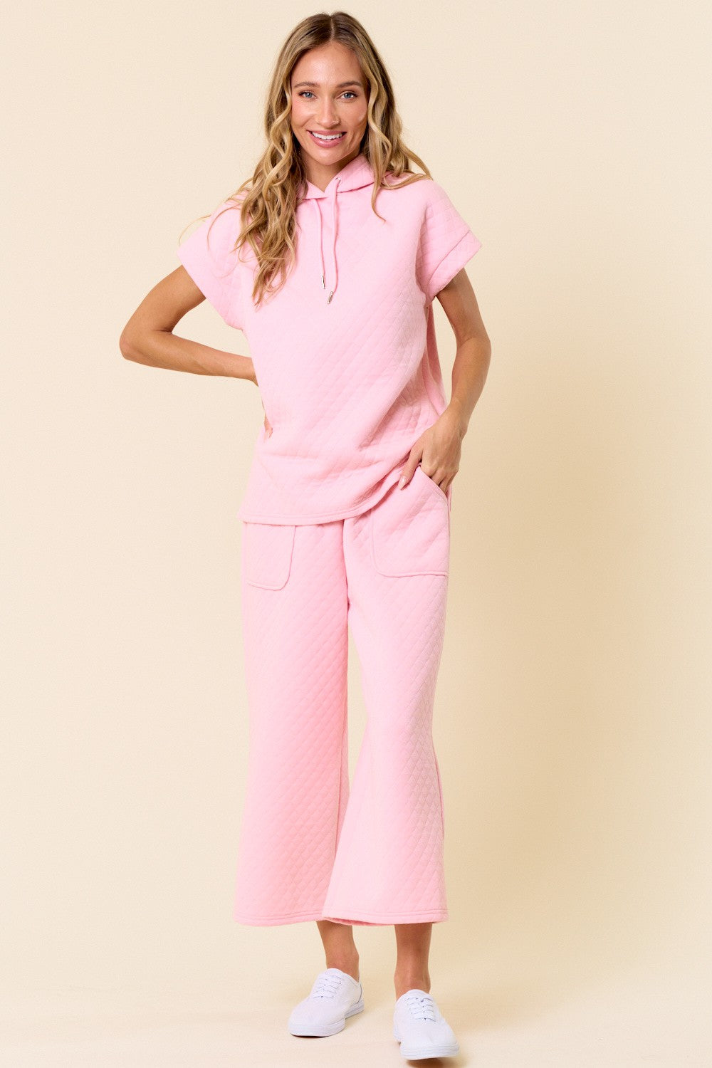 Meet your new favorite set. This set is made from a soft and cozy waffle knit fabric. The top is hooded with two drawstrings and has short sleeves. The pants are slightly flared with an elastic waistband, tie front, and exposed front pockets.